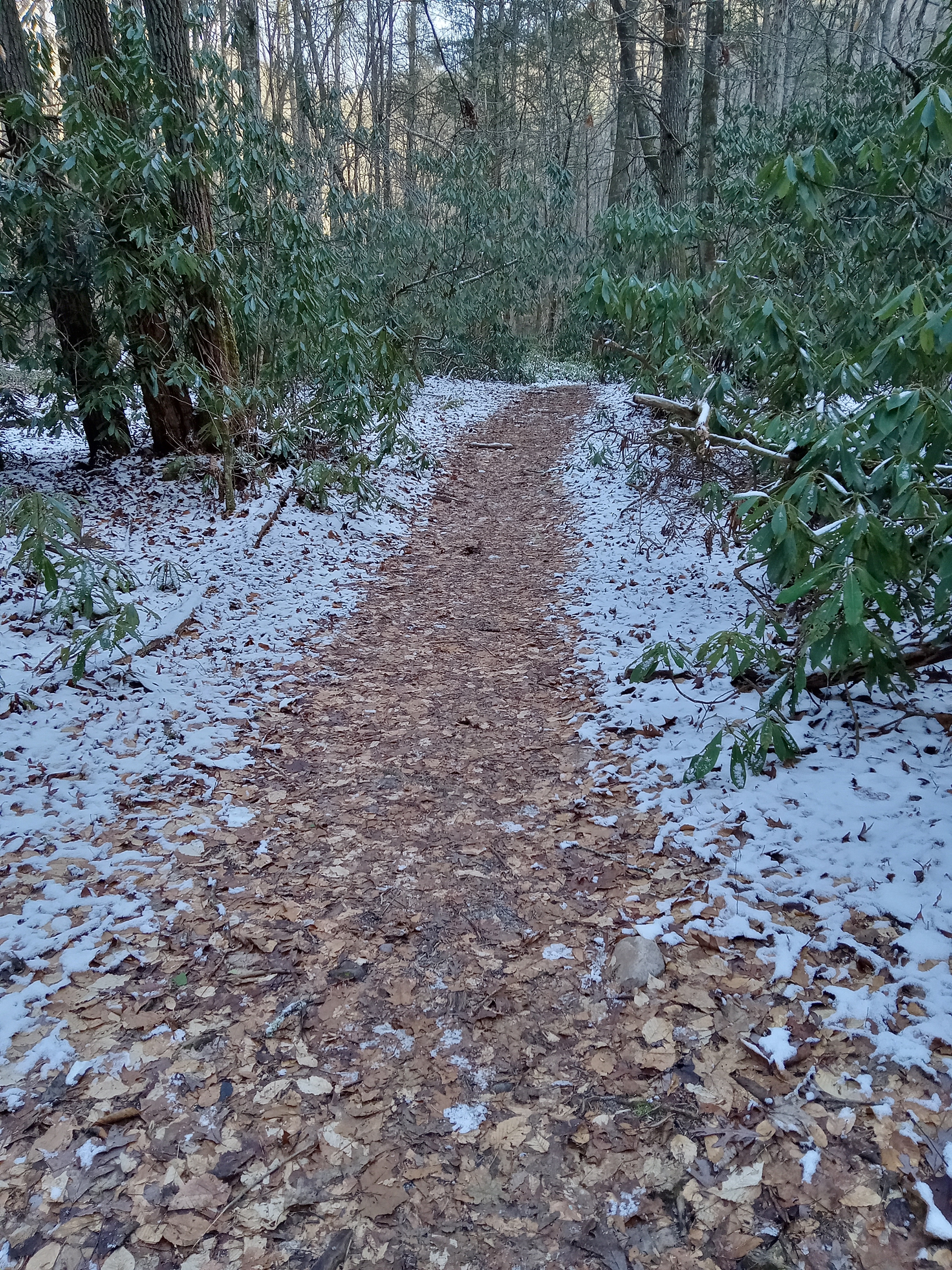 The trail crossed the creek several times as it wound gently upslope through an open woods.